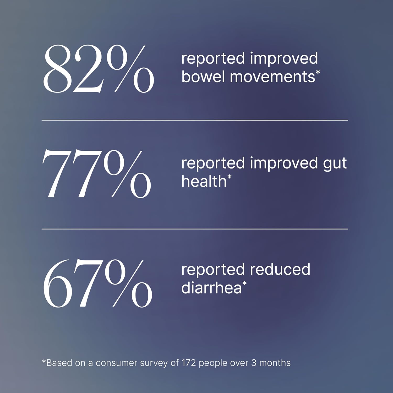 What consumer surveys have been done on Akkermansia?In a consumer study of 172 people taking Akkermansia over 12 weeks of product use, 82% reported improved bowel movements, 77% reported improved GI/gut health, 71% reported reduced occasional gas & bloating, and 67% reported reduced diarrhea. In a separate consumer study of 86 people taking Akkermansia for 3 months, 91% reported reduced overall food cravings and 86% reported reduced sugar cravings.